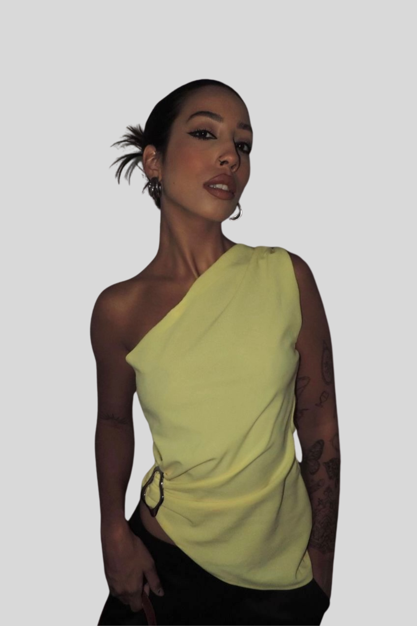 O amarelo vibrante, combinado com a manga única, cria um visual impactante e memorável. Perfeita para mulheres que buscam um look autêntico e cheio de personalidade.